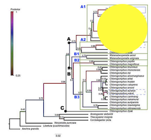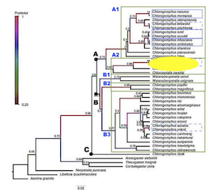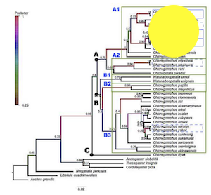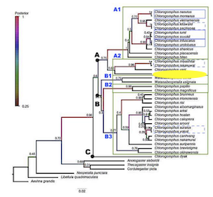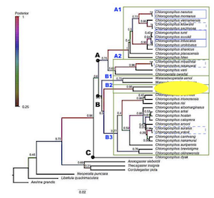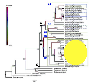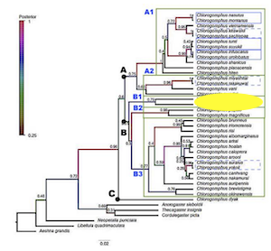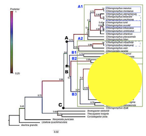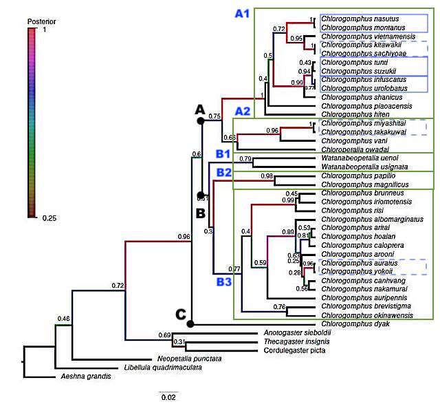La démarche de Schneider & al. (2025) est inclusive. Ainsi l’ensemble des Chlorogomphidae sont ramenées au genre Chlorogomphus (branche ABC de l’arbre annoté ci-dessous). Ma démarche est plus conservatrice et informative, aussi j’ai analysé chacune des branches en regard des efforts antérieurs de classification taxonomique menée par les auteurs. Il s’en dégage les éléments suivants. La branche B correspond au genre Chlorogomphus, alors que la A est conforme au genre Orogomphus. Il convient pour la C de prévoir un genre nouveau que je propose sous le nom d’Insulochlorogomphus (gen. nov.), un nom basé sur la répartition insulaire des espèces correspondantes sur la Péninsule malaise et les îles de Malaisie voisines. Dans le détail la sous-branche A1 est conforme aux Sinorogomphus, qui se placent en sous-genre d’Orogomphus, suivi en A2 d’Orogomphus (Petaliorogomphus). La sous-branche B1 rassemble les espèces du sous-genre Chlorogomphus (Watanabeopetalia), B2 pour Chlorogomphus (Chlorogomphus), incluant logiquement le type du genre correspondant, B3 est adéquate pour une variations d’espèces aux ailes colorées (comme pour le sous-genre précédent) qui sont proposée sous Orogomphus (Chromophyllus) (subgen. nov.) mais convenant en définitive pour le sous-genre existant à lire comme Orogomphus (Vietnamchlorus). Le nom Chromophyllus, est basé sur le fait que les ailes comme des « feuilles » (phyllus) sont le plus souvent très colorées (chromo).