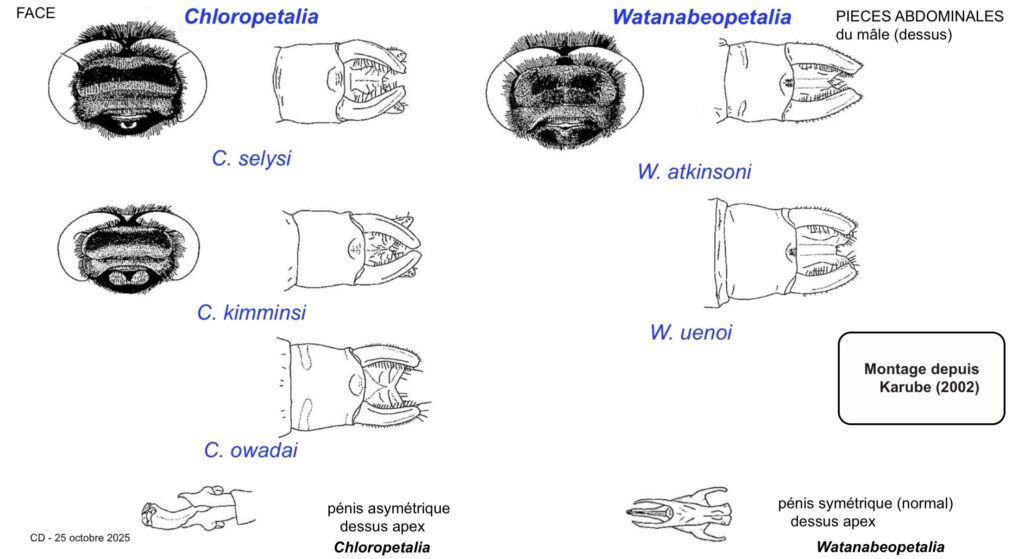 Les Chloropetalia sont caractérisés principalement par l’asymétrie apicale du pénis des mâles alors qu’il est symétrique chez les autres Anisoptera dont le nouveau genre Watanabeopetalia. Son appartenance aux Chlorogomphinae est en conséquence « incertaine » selon Karube (2002). Cet « isolement » relatif et le rapprochement fait plus haut de Watanabeopetalia (sous-genre de Chlorogomphus) est tout à fait cohérent avec ces indications (com., 25 octobre 2025) Les deux genres se ressemblent par leur tête large, le thorax marqué de larges bandes jaunes et la forme aplatie de la moitié apicale des pièces terminales des mâles.