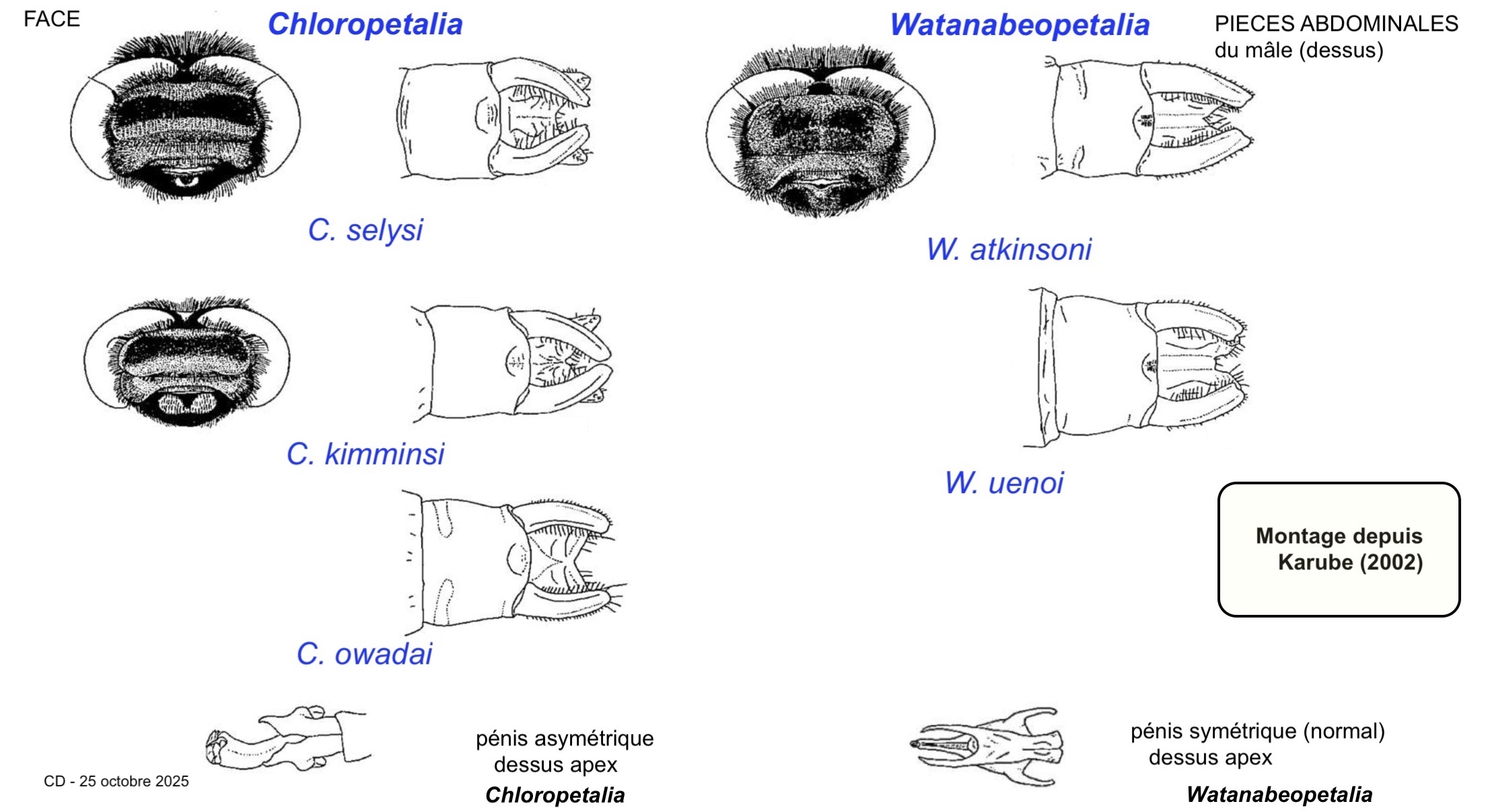 • 27 au 30 octobre 2025 – Approfondissement des lectures (Karube 1995, Asahina 1995, Karube 2002, 2013, Zhang in Odonata of China [2022]) et mise en cohérence. L’examen de la paire Chlorogomphus takakuwai / C. miyatashi très proche génétiquement, révèle que la paire, même si elle montre des similitudes ou des variations morphologiques, présente des caractéristiques, certes subtiles qui résistent à leur fusion. Ceux-ci méritent au moins le rang de sous-espèce. La génétique, ce n’est pas de la synonoymie automatique.