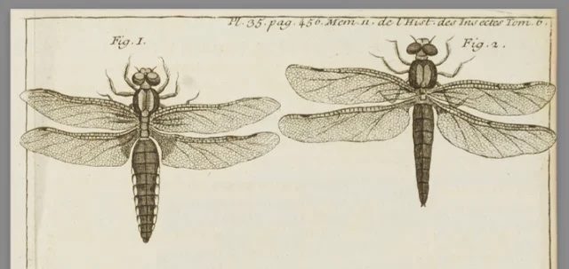 - de Réaumur R. 1742 – Mémoire pour servir à l’histoire des Insectes. Onzième mémoire. Des mouches à quatre aisles nommées Demoiselles. – Imprimerie royale, Paris [Demoiselles] : 387-457.