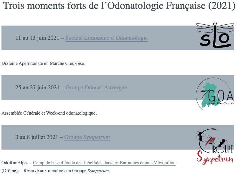 - 26 juin 2021 – Journée des Libellules de France, improvisée et animée par Cyrille Deliry (Histoires Naturelles), elle sera suivi alors chaque année par le Grand Marathon des Libellules lors du week-end du solstice de juin en collaboration avec La Selysienne.