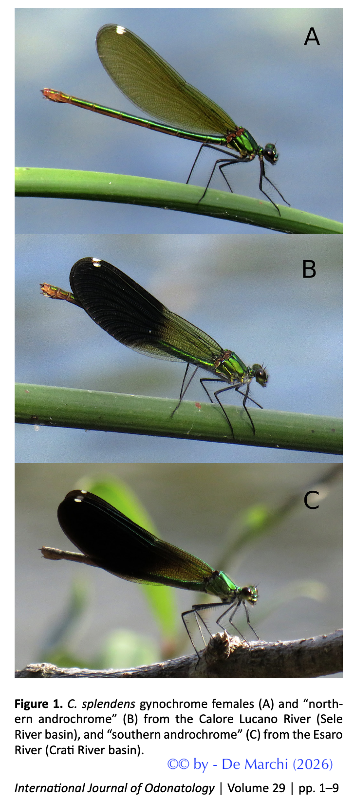 - De Marchi G. 2026 – Intraspecific rather than interspecific drivers of female-limited polymorphism in Calopteryx splendens (Odonata: Calopterygidae). – Intern. J. of Odonatol., 29, 7 janvier 2026 : 1-9.