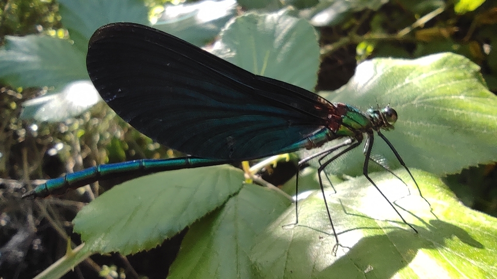 « Tous » les mâles (N=49) de la zone considérée sont très similaires. Leur abdomen foncé tend vers le noir sans aucun « semblant » de rouge perceptible et ce quel que soit l’état de maturité des individus. J’ai repéré néanmoins quatre individus où ce patern diffère : trois au noir atténué et un présentant des teintes rougeâtres. Pour tous les spécimens le motif de coloration de la marque alaire a la même forme avec une zone éclaircie bien dessinée à la base, plus étendue au bord inférieur de l’aile. La coloration sombre (noire) de l’abdomen est compatible avec Calopteryx haemorrhoidalis f. nurag Deliry, [2008] tels que je les ai rencontrés en Sardaigne et en Corse. Pour ces deux îles, les femelles avait souvent un apex sombre, parfois un bandeau alaire.