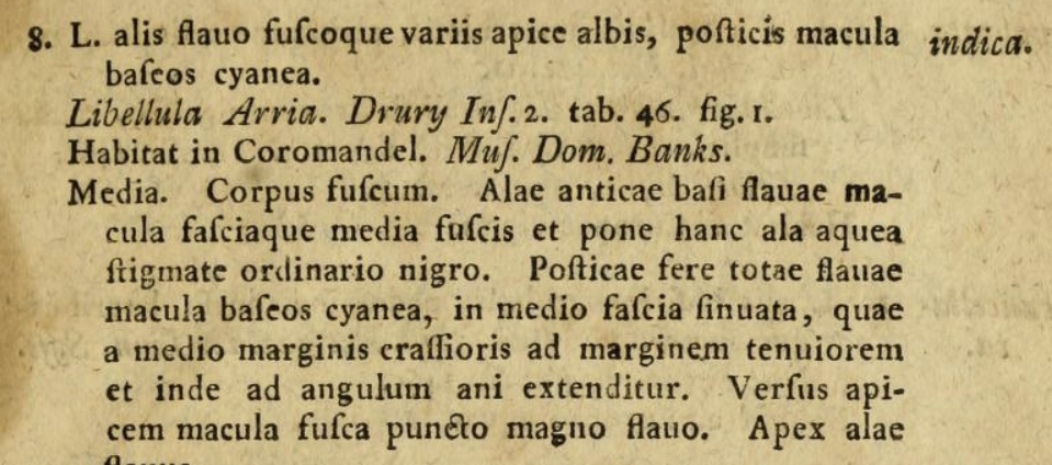 - Libellula indica Fabricius, [1781] : Libellula variegata Linnaeus, [1767] (édition 1767 du Systema Naturae), Libellula arria Drury, [1773] : Indes (coll. King.).