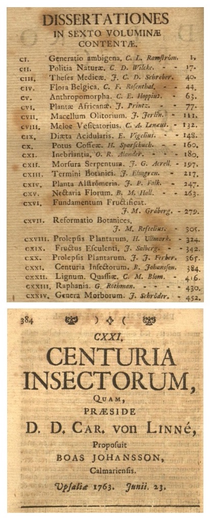 Johansson B. 1763 – Centuria insectorum rarorium. – Amoenitates Academicae, vol. 6, dissertation CXXI, 23 juin 1763 (Upsala) : 384-415. – ONLINE