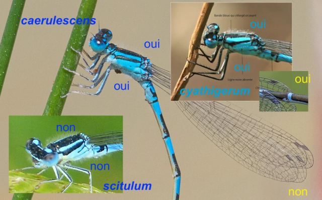 Constatant sur la base photographique d'une ♀ de Coenagrion caerulescens que celle-ci présentait des caractéristiques au niveau thoracique propres à un Enallagma (voir ci-dessus), j'y cru un moment à une erreur de détermination, précisant que je n'avais toutefois pas vérifié la forme du pronotum (com., 24 mai 2025). J'en ai informé Jean-Michel Faton, auteur de la photographie qui en réponse confirme sa détermination, à raison car il souligne que son spécimen a des taches post-oculaires "géantes", un pronotum très marqué en U et de petits triangles noirs vers la terminaison de l'abdomen, qui est clair (in litt., du 24 mai 2025). Ce sont en effet autant de critères qui nous avions utilisé pour la détermination de Coenagrion caerulescens. Toutefois il apparaît que la ligne médiothoracique est large et que les côté du thorax s'avèrent non marqués, sinon presque. Le pronotum, élément structurel, ne fait aucun doute sur la bonne détermination. L'examen de nombreuses photographies fait le 25 mai 2025 révèle une bonne constance de ces caractéristiques chez les ♀. Ils sont atténués chez les ♂ qui s'approchent plus des véritables Coenagrion, sans en avoir parfaitement les caractéristiques. L'examen de la terminaison alaire au-delà du ptérostigma ne révèle toutefois la multiplication des cellules de bordure, comme c'est le cas chez les Enallagma véritables.