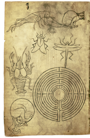 Libellule, Mouche, Ecrevisse, Labyrinthe - Carnet de dessin de Villard de Honnecourt (estimé 1225-1235) - BNF 19093