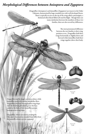 La tête porte des antennes courtes et de gros yeux composés de nombreuses facettes, trois ocelles et des pièces buccales broyeuses. Le thorax possède trois paires de pattes et deux paires d'ailes membraneuses. L'abdomen est constitué de dix segments dont le dernier comporte des cerques préhensiles chez les mâles. Ce sont des Insectes hétérométaboles dont les larves ou naïades sont aquatiques et les adultes aériens fondamentalement différents et séparés par une mue imaginale. Les larves se caractérisent par la présence de pièces buccales en forme de masque extensible. Les Odonates sont des prédateurs tant à l'état larvaire qu'à l'état imaginal [2019].