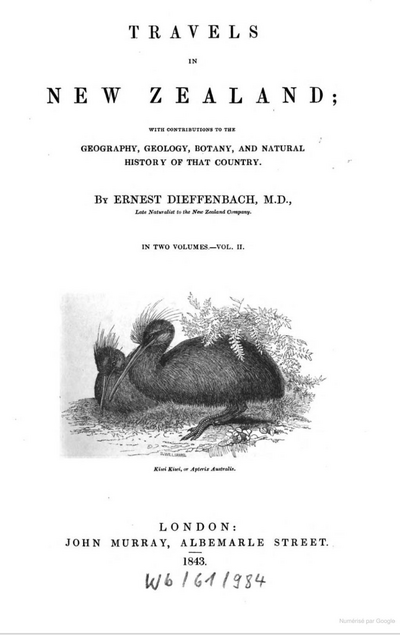 Dieffenbach E. 1843 - Travels in New Zealand, with contributions to the geography, geology, botany and natural history of the country. - Murray, London, vol. 2 : 281-282. - ONLINE