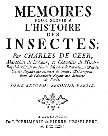 La seconde partie du tome second comprend une série d'espèce et est rédigée dans le prolongement du travail de F. de Réaumur (1742) dont l'auteur reprend une partie des éléments.