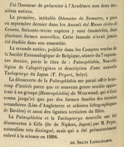 de Selys Longchamps E. 1889 (v1)[1] - Palaeophlebia, nouvelle légion de Caloptérygines, suivi de la description d’une nouvelle Gomphine du Japon : Tachopteryx pryeri. - Société Entomologique de Belgique. Compte-rendu de Séance du 7 septembre 1889 : tiré à part (incl. CLIII-CLXIV).