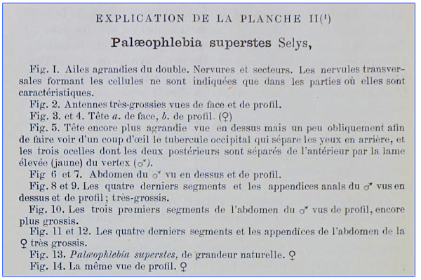 - Lors de la réunion de l'Académie royale des sciences de Belgique du 9 novembre 1889, il se réfère à son article (édité sous trois versions en fait !), il rapproche, probablement alerté par H.A.Hagen, le genre Palaeophlebia est à rapprocher du genre fossile Heterophlebia de Westwood (recte Brodie 1849) Ŧ trouvé dans les terrains du Lias d'Angleterre.